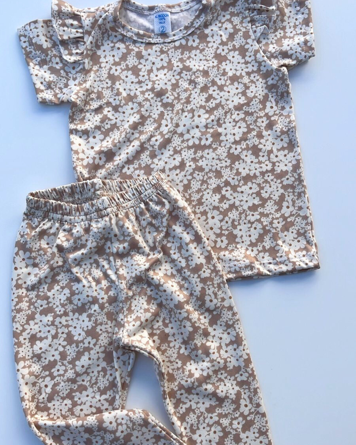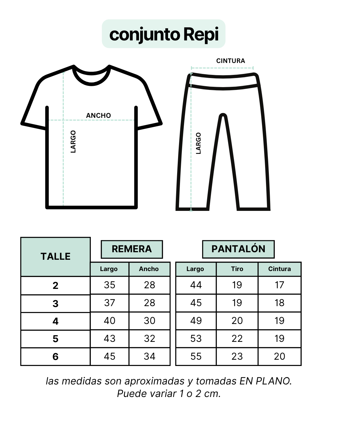 conjunto de remera mangas corta + pantalón con detalle de moñito en puños.