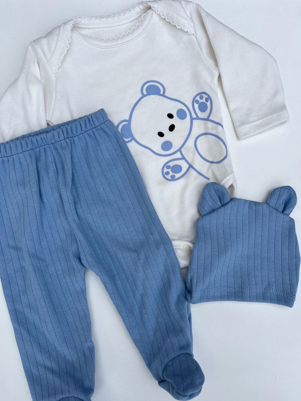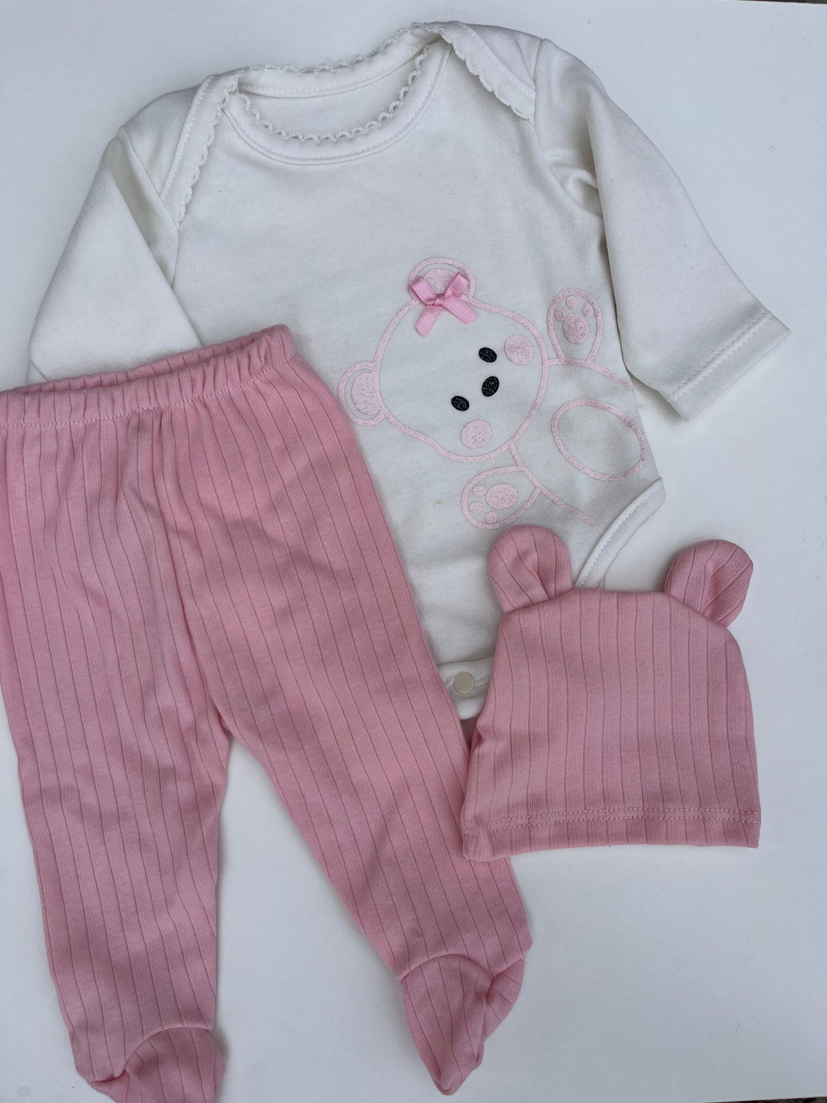 Body mangas largas con cuello americano + pantalón ranita + gorrito.