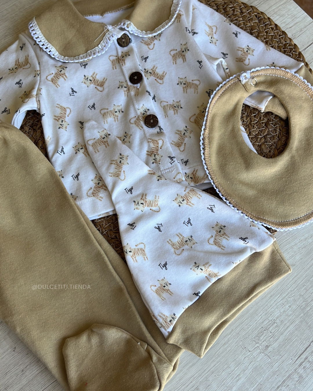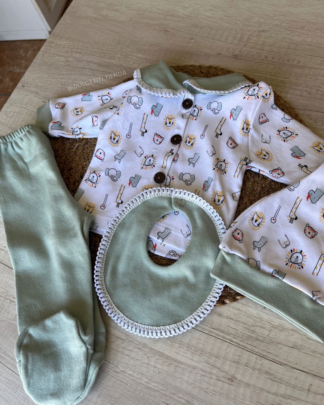 este set viene en caijta. Contiene: campera estampado, pantalón ranita lisa, gorro y babero.